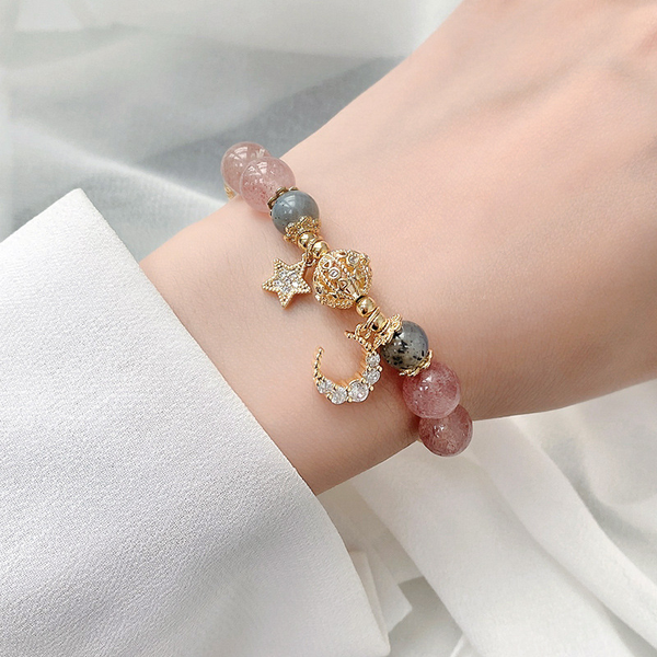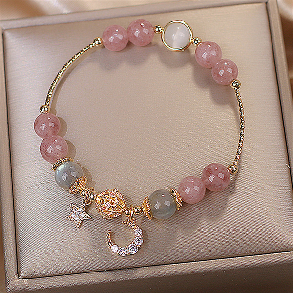 This elegant women's bracelet, crafted to embody the beauty of the starry sky. Featuring delicate crystal details and alloy moon-and-star accents, this bracelet combines a retro charm with a modern pastoral aesthetic. Its natural stone finish complements any outfit, making it perfect for everyday wear or special occasions.